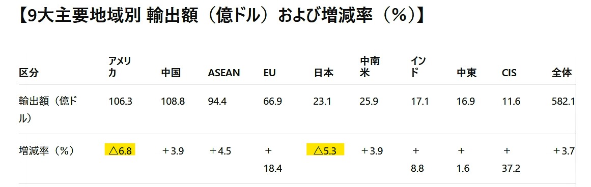 対合衆国、対日本の輸出金額が対前年同期比でそれぞれ「-6.8%」「-5.3%」と減少しています。