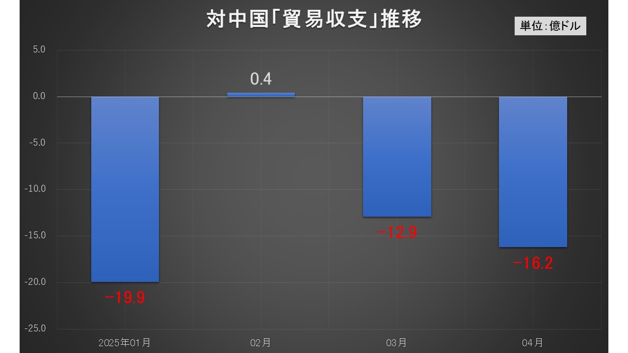 2025年に入ってからの「対中国貿易の貿易収支」は以下のように推移しています。