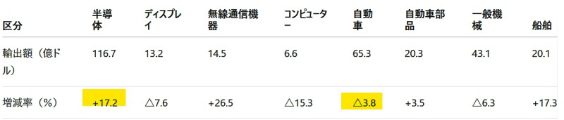 半導体は対前年同期比で「+17.2%」と堅調ですが、自動車が「-3.8%」と減少している点には注意が必要です。