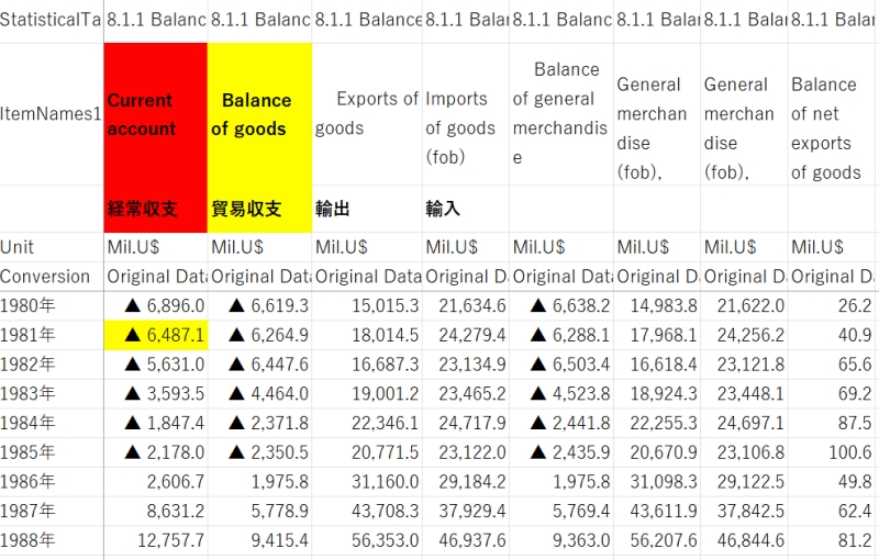 ↑韓国の1981年の経常収支は「-64億8,710万ドル」(黄色のマーカーでフォーカスしたセル)。データ出典は『韓国銀行』の「ECOS」。