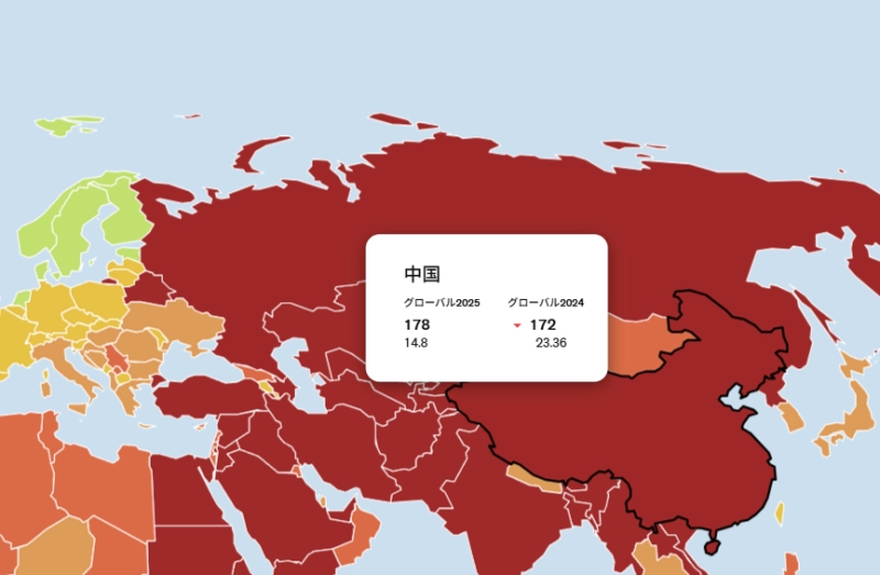 ↑中国に報道の自由などあるわけがなく、グローバルスコアは「14.8」しかなく、世界178位。世界180カ国中ワースト3位で2024年度版から6ランクもダウンしました。