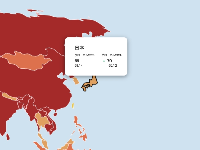 ちなみに日本の2025年度版の結果は、以下のとおり「ポイント:63.14」で「世界66位」です。