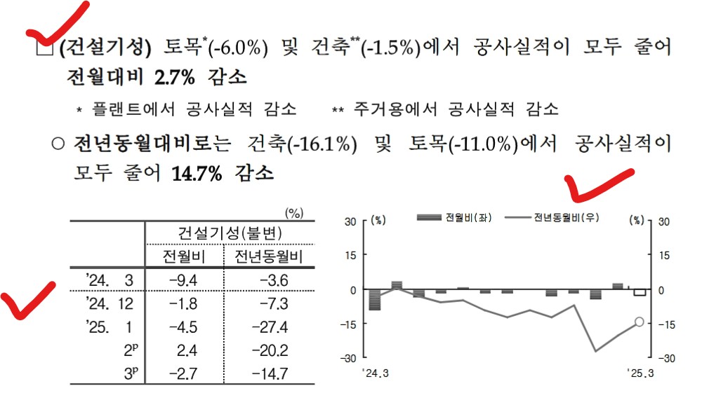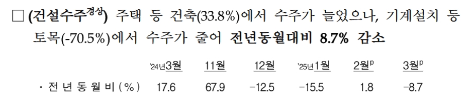 建設不況が続く韓国で注目されている投資の指標が問題です。「建設既成」が「-2.7%」となっています。また当月も前月比で減ったのか――です。