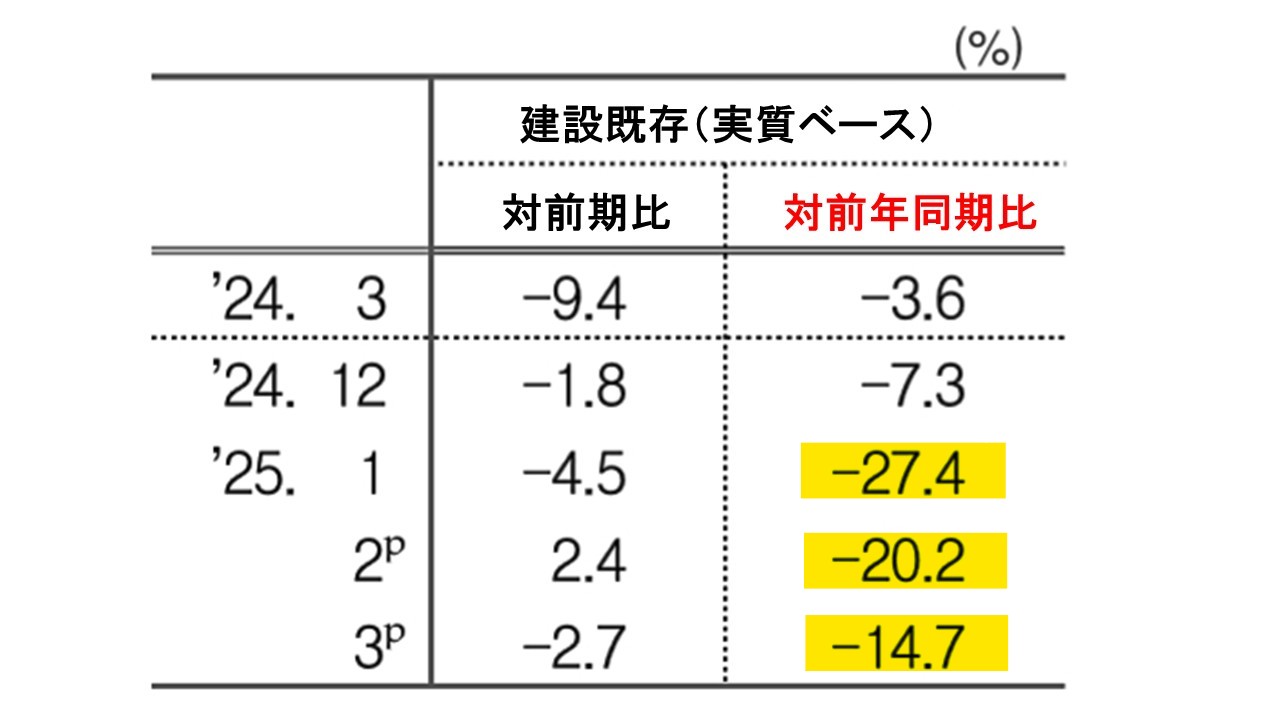 対前年同期比では建設実績はずっとマイナスを続けており、2024年04月だけが「プラス」になっています。しかもそのマイナス具合は2025年になってから、第1四半期はまさに絶不調であることが分かります。