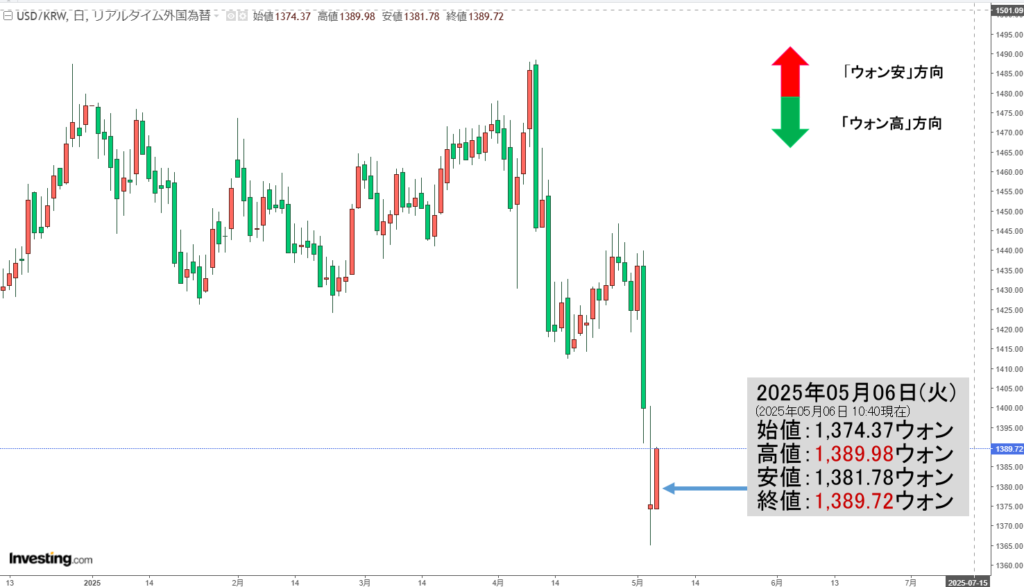 本日はこどもの日の振替休日で韓国はお休みです。株式市場は休場となっています。2025年05月06日(火)15:42現在、ドルウォンのチャートは以下のようになっています(チャートは『Investing.com』より引用)。陽線が伸びています。...