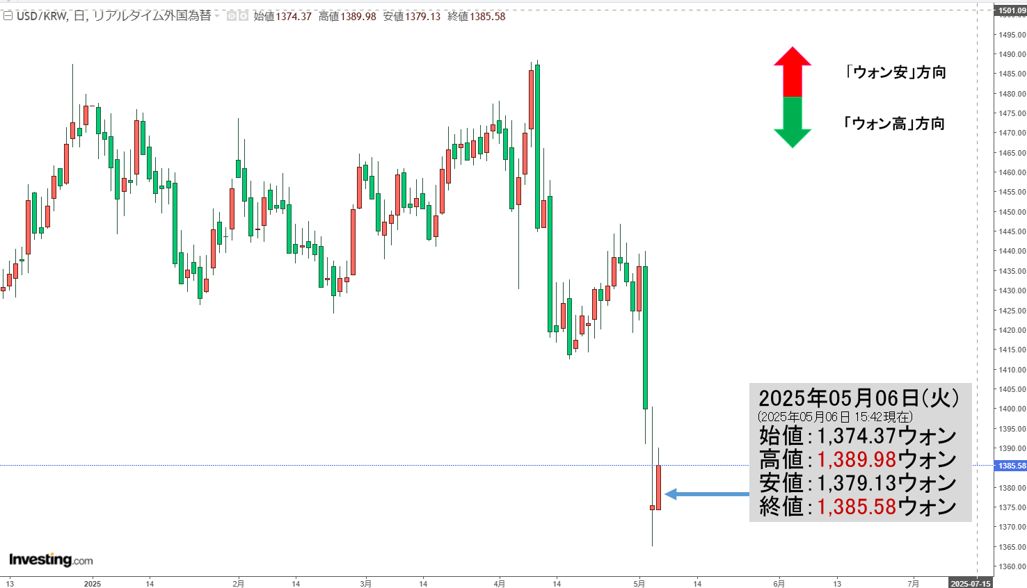 2025年05月06日(火)15:42現在、ドルウォンのチャートは以下のようになっています(チャートは『Investing.com』より引用)。