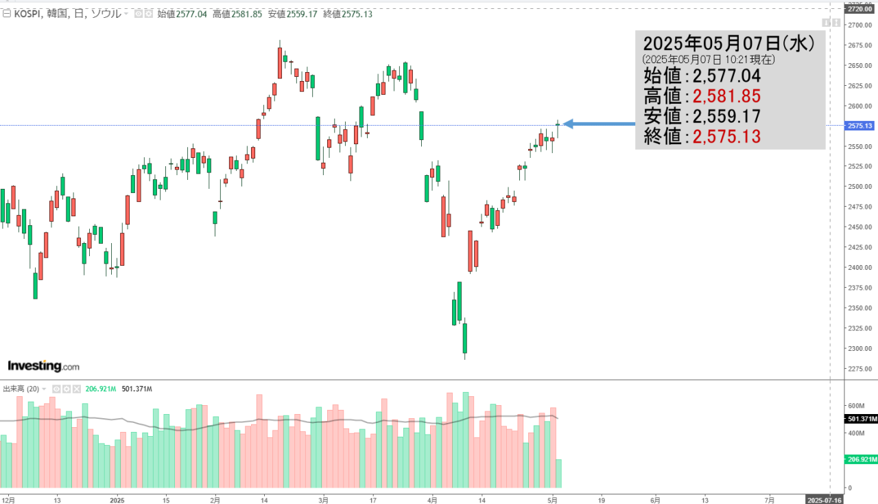 2025年05月07日(水)10:21現在、KOSPI(韓国総合株価指数)のチャートは以下のようになっています(チャートは『Investing.com』より引用)。