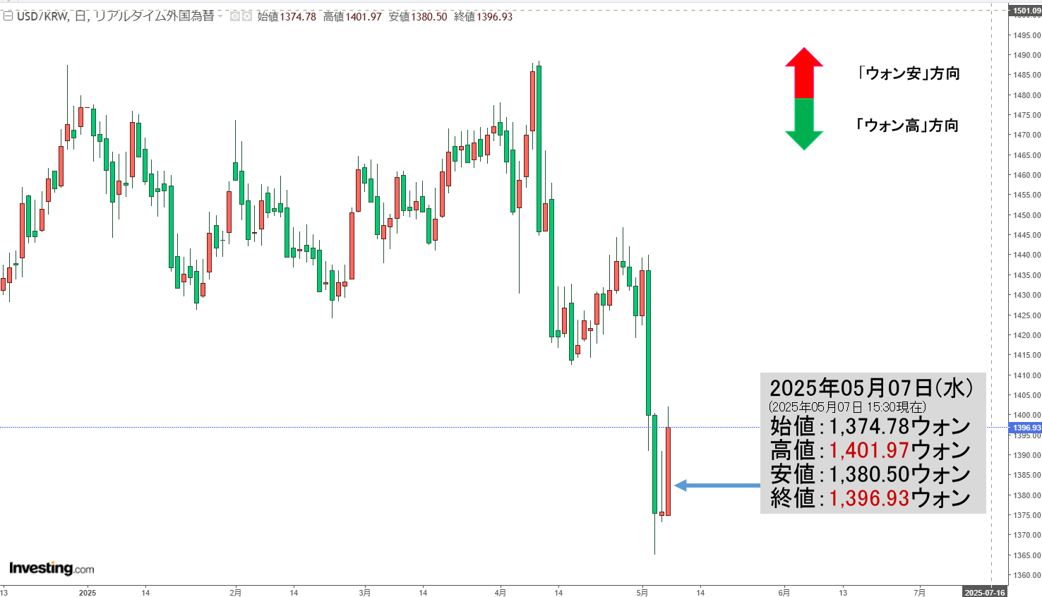 2025年05月07日(水)15:30現在、ドルウォンのチャートは以下のようになっています(チャートは『Investing.com』より引用)。