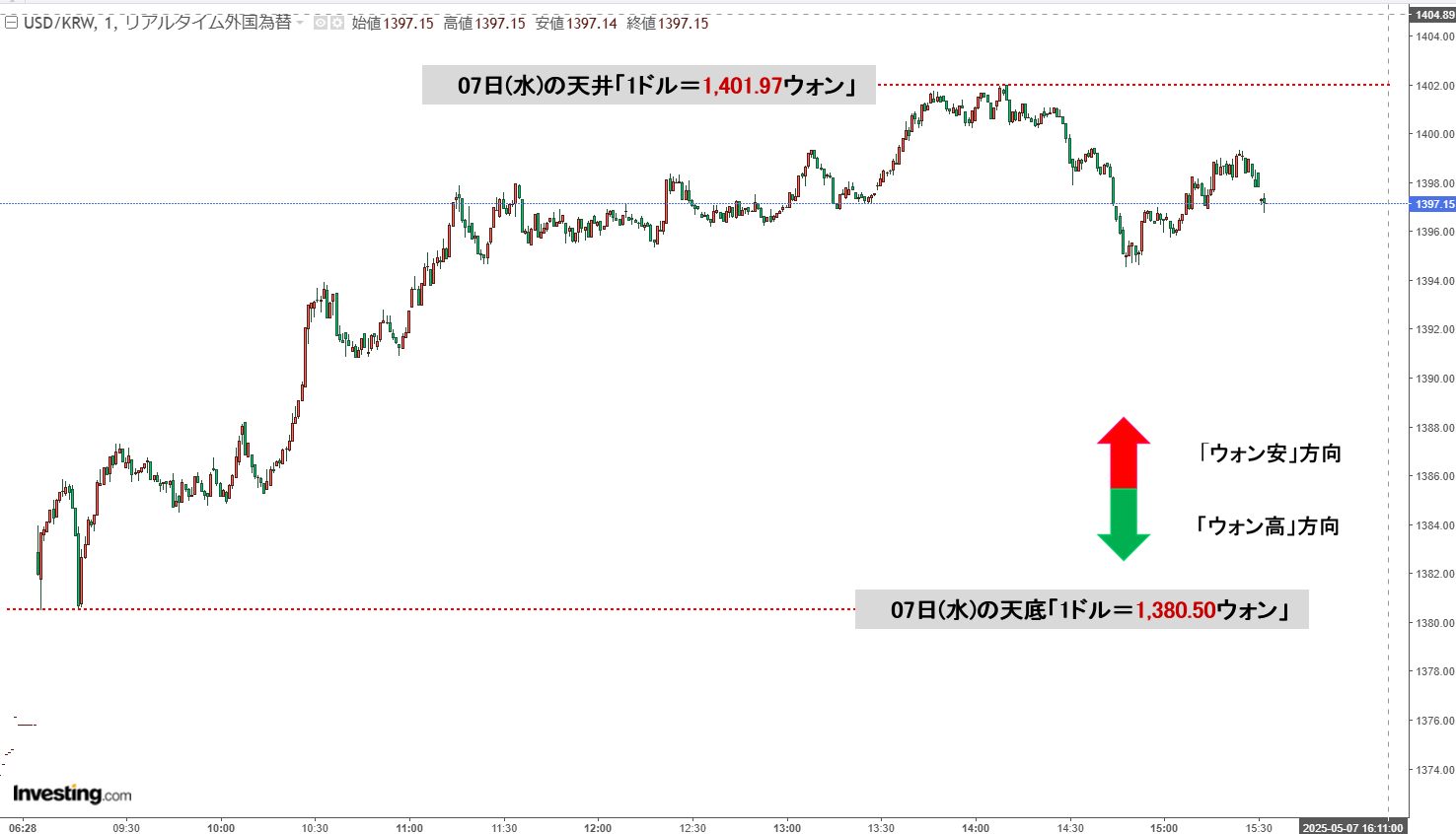 現在の天井は「1ドル=1,401.97ウォン」、天底は「1ドル=1,380.50ウォン」です。