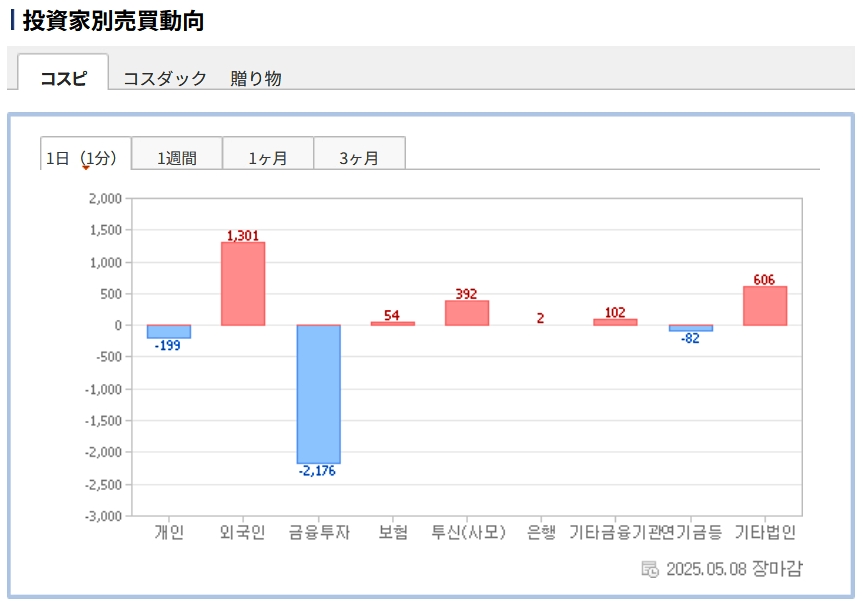 個人投資家は「199億ウォン」の売り越し。一方の外国人投資家は「1,301億ウォン」の買い越しです。
