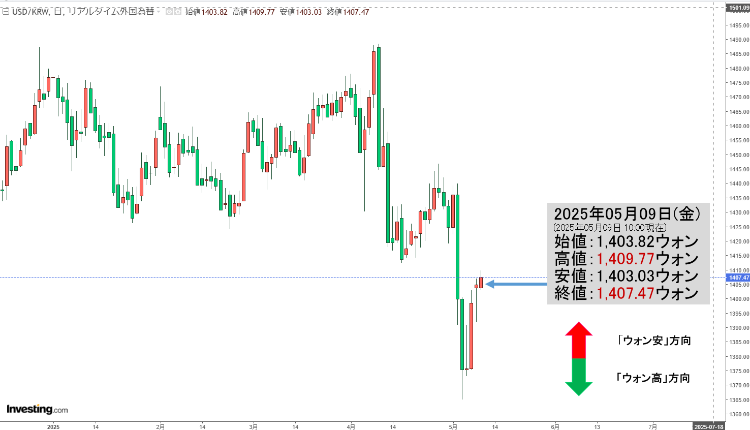 2025年05月09日(金)15:30現在、ドルウォンのチャートは以下のようになっています(チャートは『Investing.com』より引用)。一時「1ドル=1,414ウォン」までウォン安が進行しましたが、戻しました。現在のところ1,400...