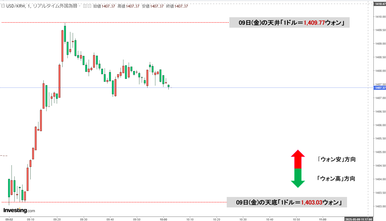 現在の天井は「1ドル=1,409.77ウォン」、天底は「1ドル=1,403.03ウォン」です。