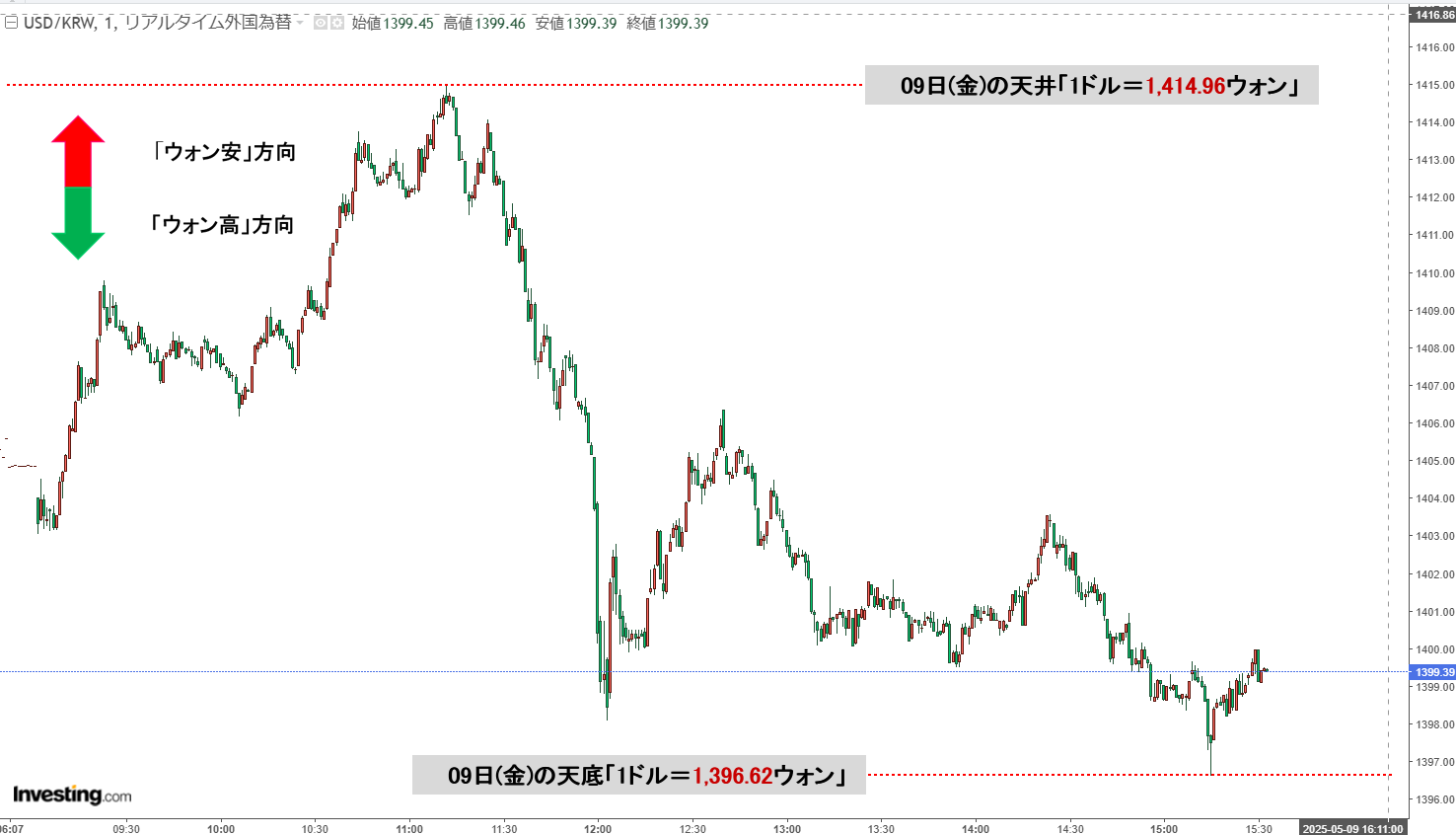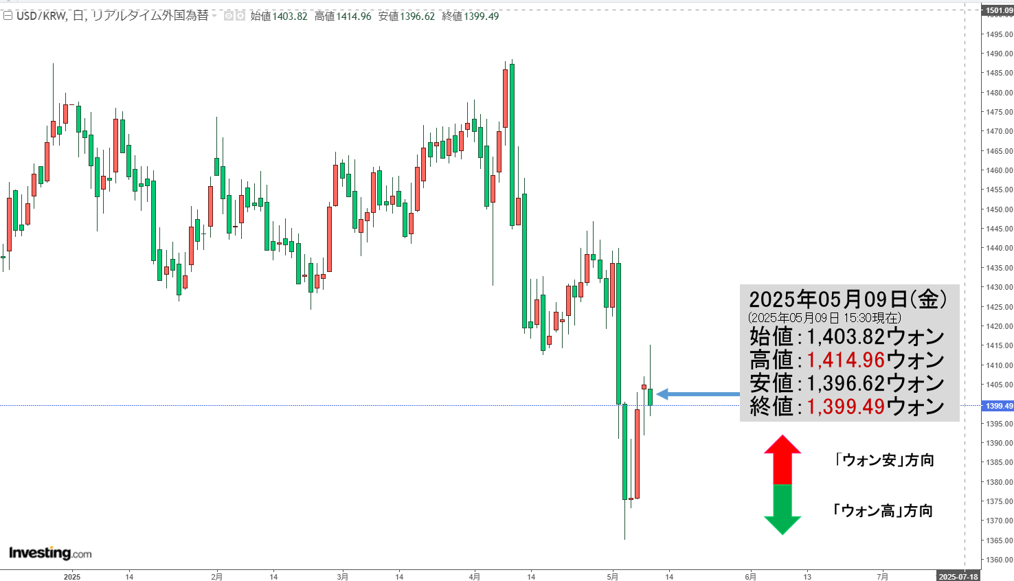 2025年05月09日(金)が(ほぼほぼ)締まりました。2025年05月10日 06:03現在、ドルウォンチャートは以下のようになっています(チャートは『Investing.com』より引用:以下同)。ローソク足1本が1分間の値動きを示す「…