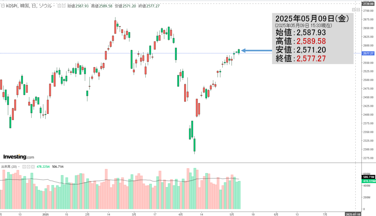 2025年05月12日(月)の韓国株式市場が開きましたので、KOSPIチャートの初動状況を以下の記事にまとめました。本記事と併せてお読み頂ければ幸いです。
