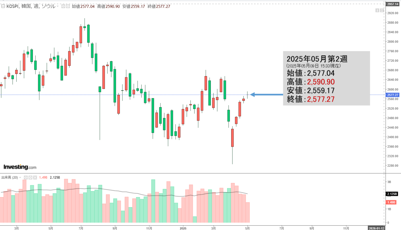 「韓国株式市場」05月12日(月)初動・KOSPI「2,591」上げて始まりで陰線。
