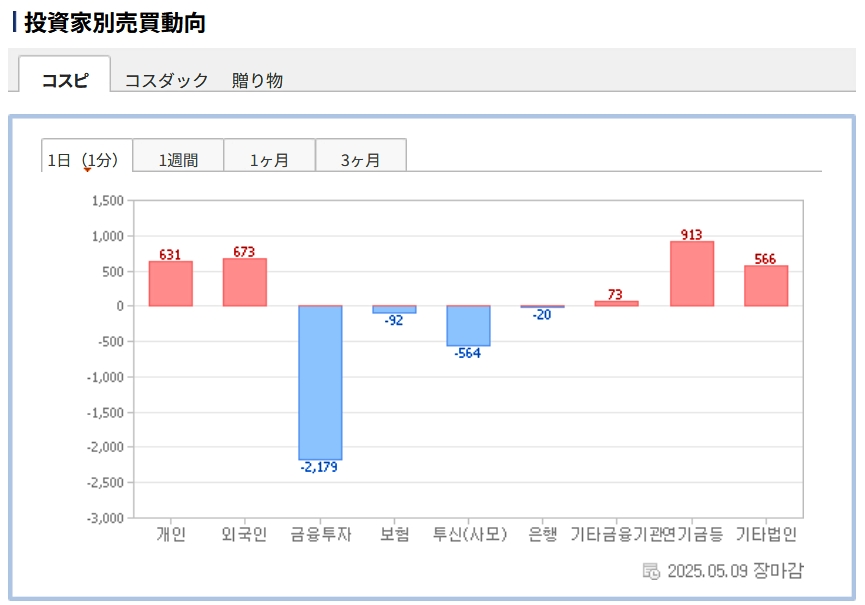 個人投資家は「631億ウォン」の買い越し。一方の外国人投資家は「673億ウォン」の買い越しです。