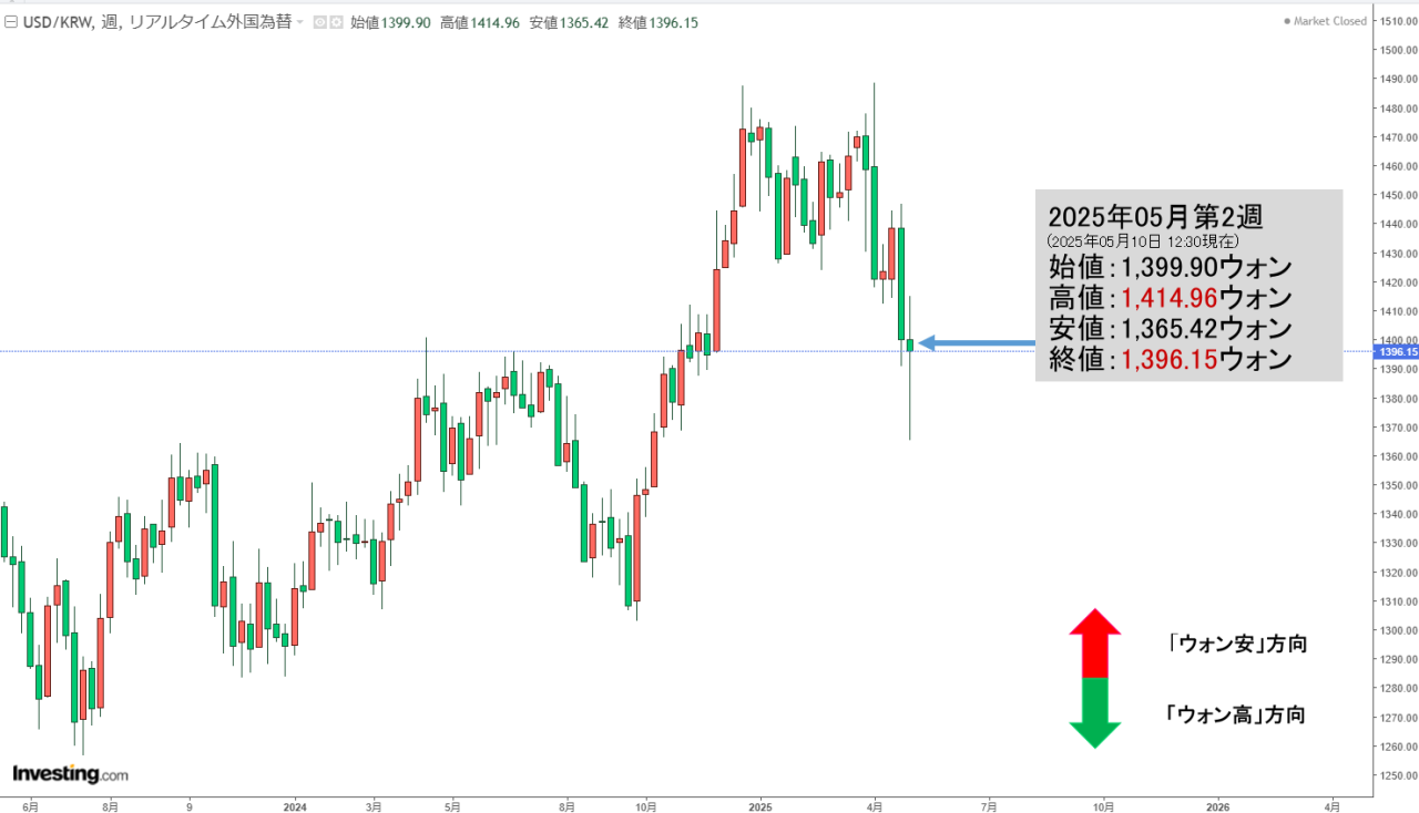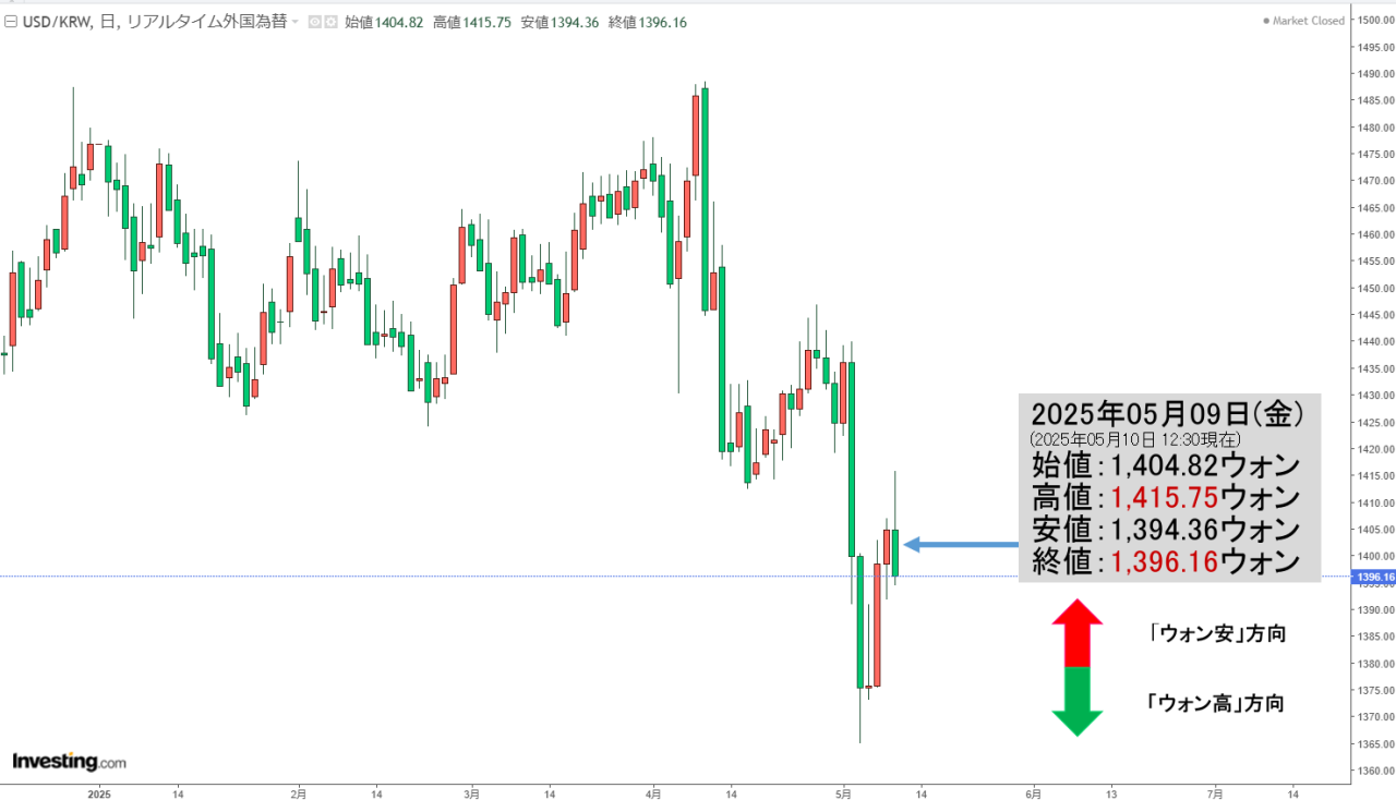 2025年05月10日 12:34現在、ドルウォンチャートは以下のようになっています(チャートは『Investing.com』より引用:以下同)。