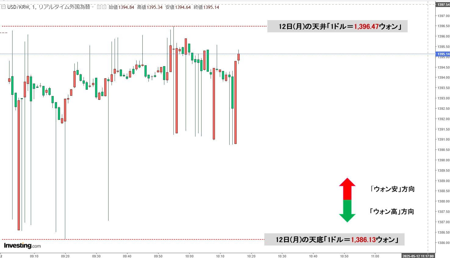 2025年05月12日(月)の市場が開きました。10:13現在、ドルウォンのチャートは以下のようになっています(チャートは『Investing.com』より引用)。