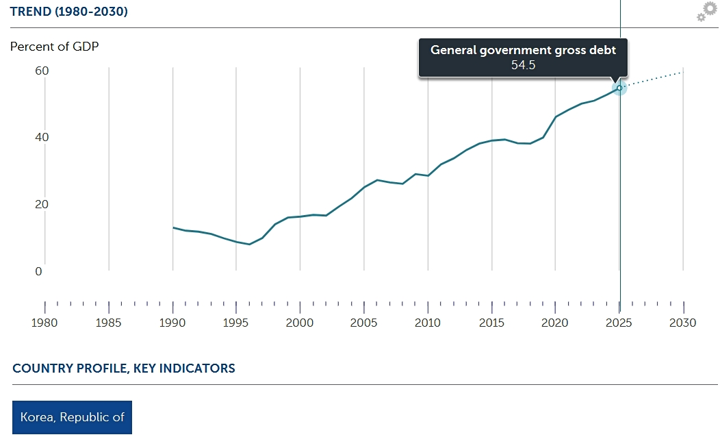 『IMF』の直近の資料によると、韓国政府負債の対GDP比率は以下のように推移すると見込まれます。