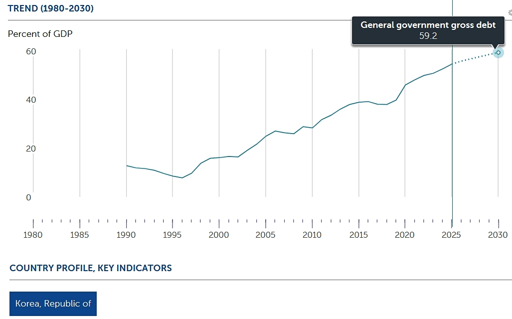 ↑韓国政府負債は2030年には対GDP比59.2%に達すると予測されています。