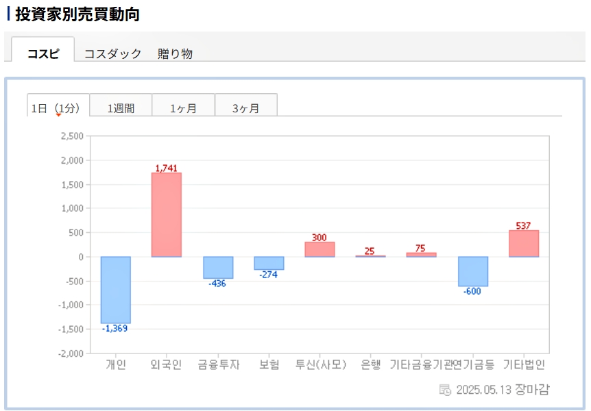 個人投資家は「1,369億ウォン」の売り越し。一方の外国人投資家は「1,741億ウォン」の買い越しです。