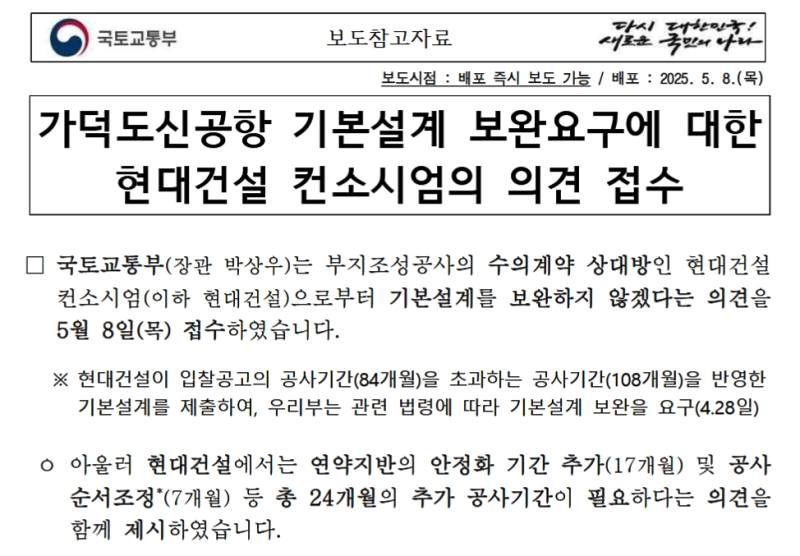 □ 国土交通部は、『現代建設』が基本設計を補完しなかったことにより、国家契約関連法令に基づいて随意契約の締結が困難となったため、現在進行中の随意契約を中断する手続きに着手し、