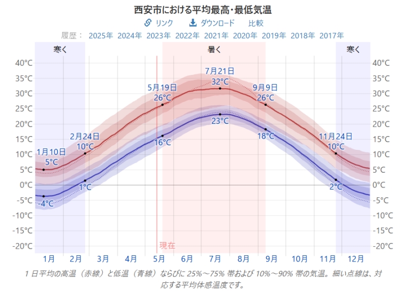 『Weather Spark』の情報によれば、西安市の平均気温というのは以下のようになっています。