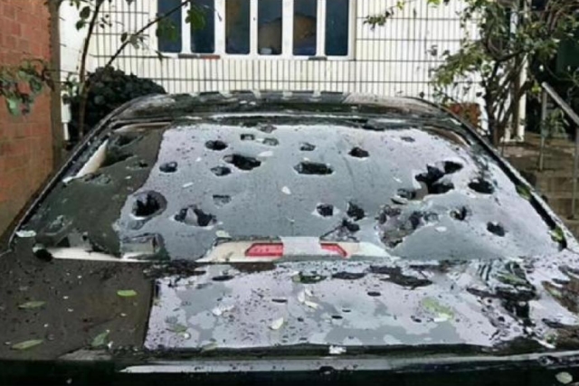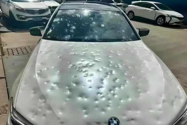 この雹の破壊力は驚異的だった。屋外に駐車された車両はまさに被害の中核で──フロントガラスは蜘蛛の巣のようなひび割れ、サンルーフには穴、車体は凹凸だらけでまるで機関銃で撃たれたようだった。