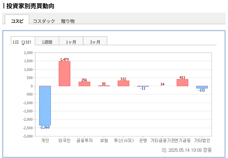 個人投資家は「2,360億ウォン」の売り越し。一方の外国人投資家は「1,479億ウォン」の買い越しです。