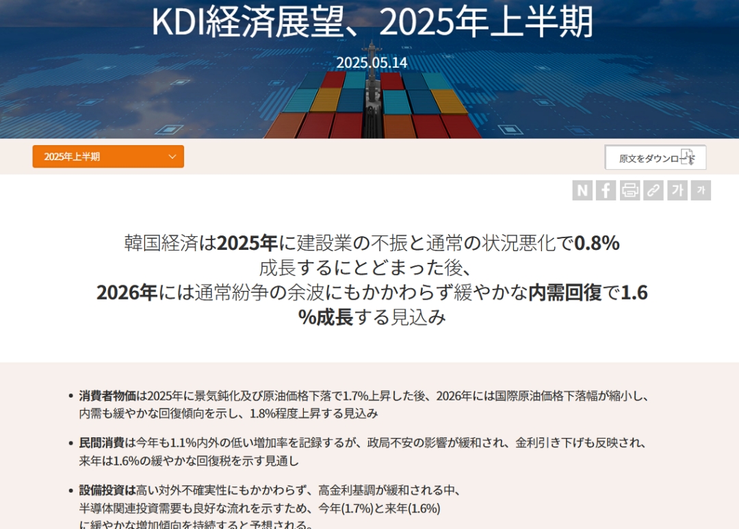 2025年05月14日、『韓国経済開発院』(略称「KDI」)が「KDI経済展望、2025年上半期」を公表しました。
