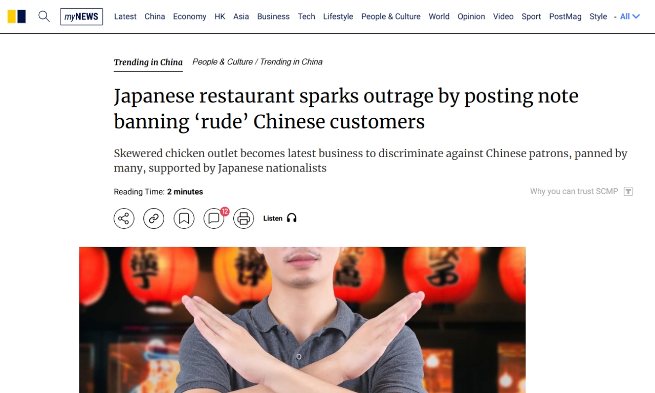 「日本国憲法によると、言語を理由にして『日本語を話せる客のみを受け入れる』という対応は合法であるが、客の人種や国籍を理由に差別することは憲法に反するというのがSCMPの説明である」
