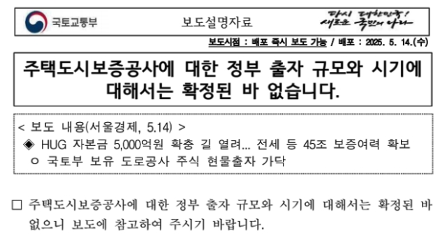 韓国メディア『ソウル経済』が、『HUG』に資本金5,000億ウォンを突っ込む用意が整ったと記事にしましたが――政府は「確定したことはありません」と否定しました。