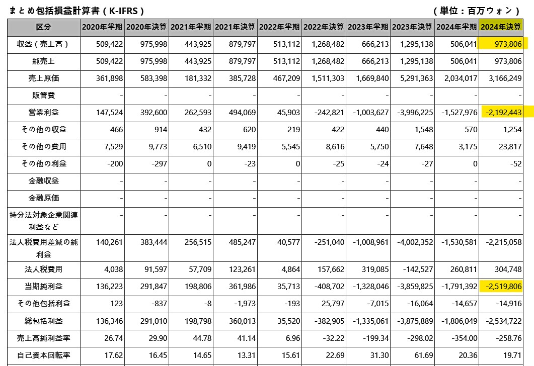 総売上が1兆ウォンに届いていないのに、営業利益が「-2.1兆ウォン」にもなるのです。これを見るだけでも異常なのがお分かりいただけるでしょう。