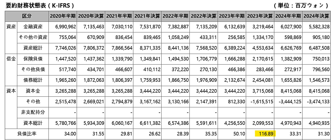 資本を注入した結果、上掲の財務諸表では「2024年決算時の資本:約4.9兆ウォン」となり、負債比率は「31.30%」に回復しました。