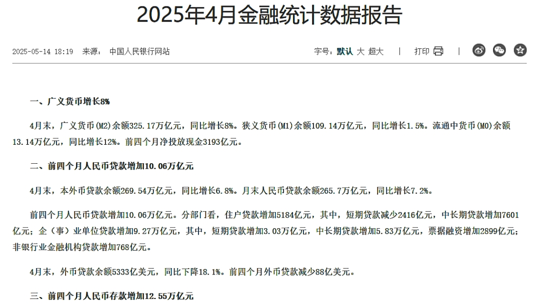 2025年05月14日18:19 出典:中国人民銀行公式サイト一、広義通貨は8%増加