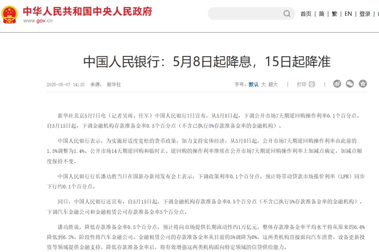 ⇒参照・引用元:『中華人民共和国中央人民政府』公式サイト「中国人民银行:5月8日起降息,15日起降准」