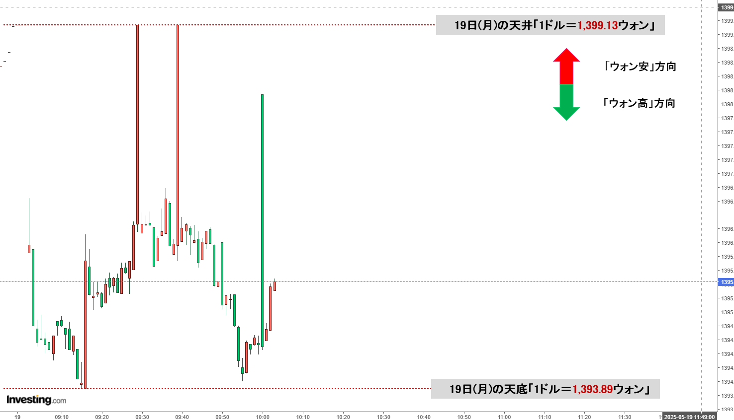 2025年05月19日(月)の韓国時間※が終わりました。15:30現在、ドルウォンのチャートは以下のようになっています(チャートは『Investing.com』より引用)。陰線で上げ損なってます。現在のところ「1ドル=1,395ウォン」近辺...