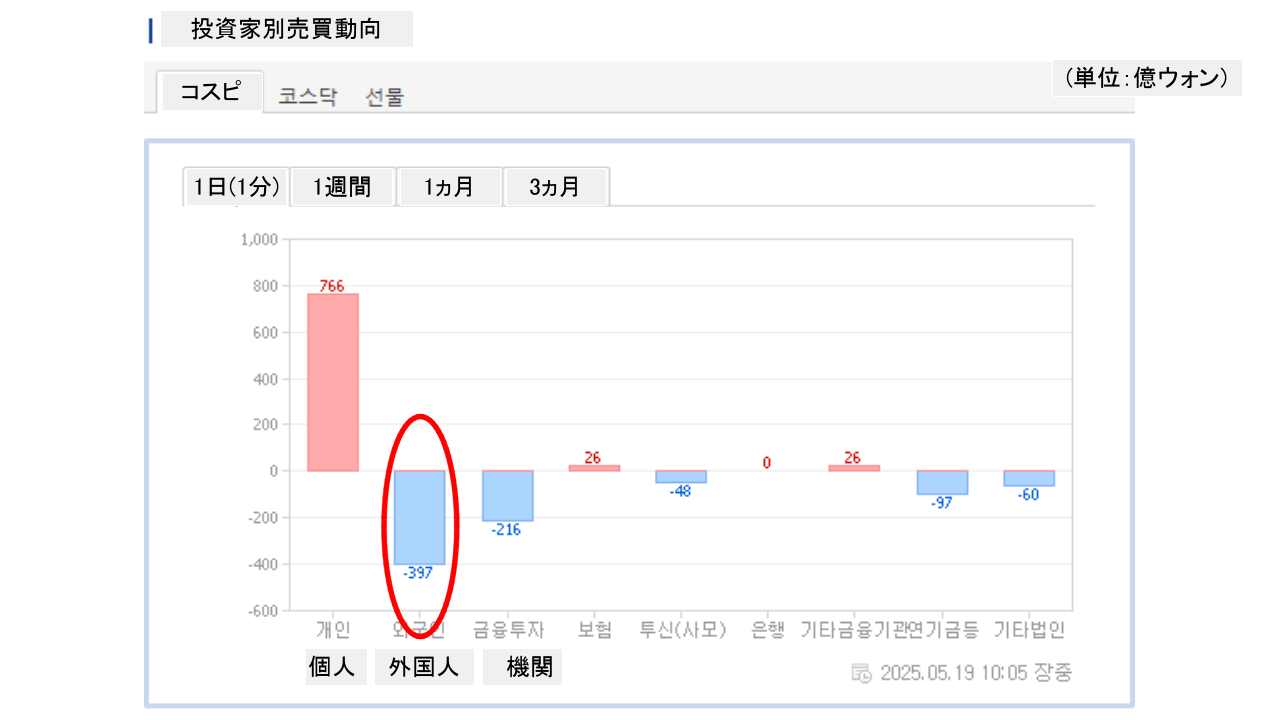 個人投資家は「766億ウォン」の買い越し。一方の外国人投資家は「397億ウォン」の売り越しです。