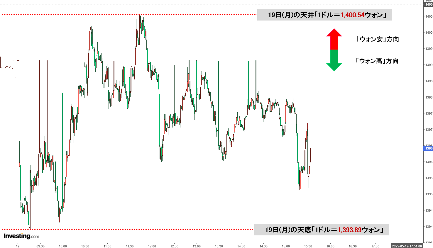 2025年05月19日(月)の韓国時間※が終わりました。15:30現在、ドルウォンのチャートは以下のようになっています(チャートは『Investing.com』より引用)。