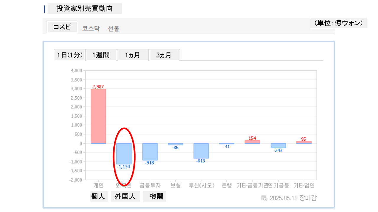 個人投資家は「2,987億ウォン」の買い越し。一方の外国人投資家は「1,134億ウォン」の売り越しです。