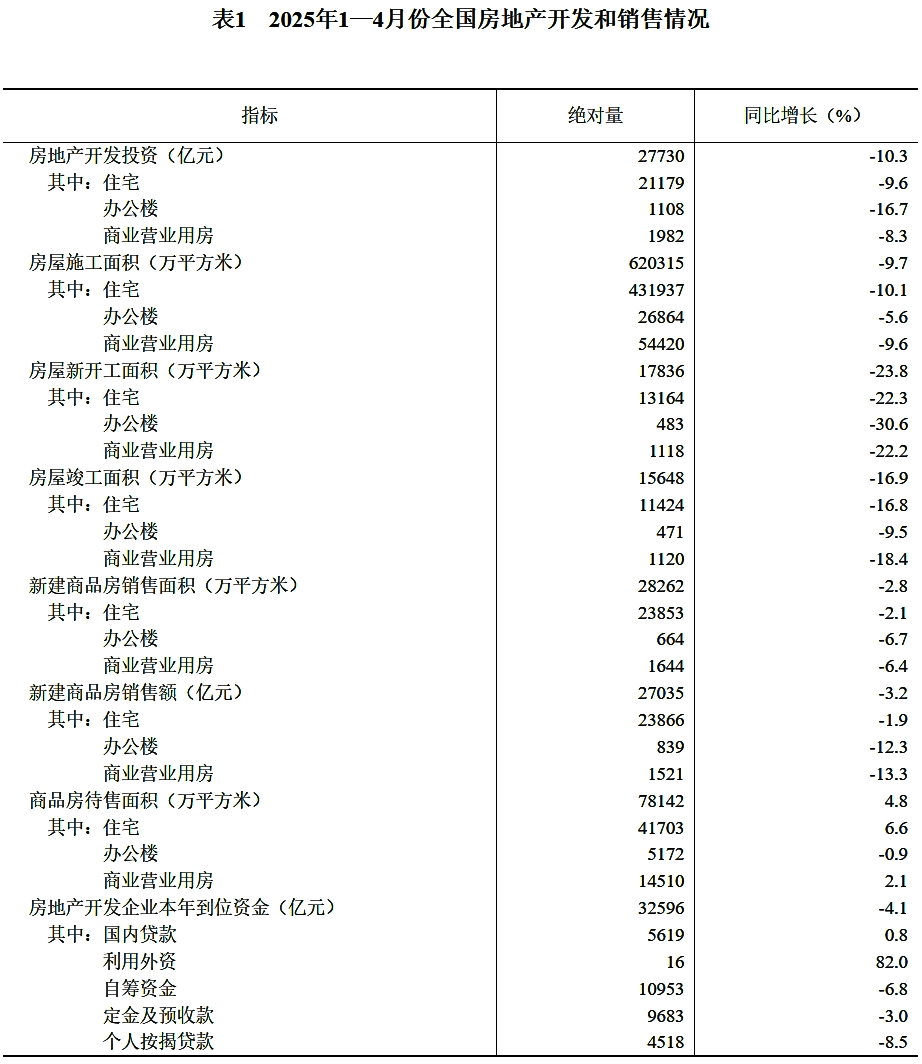 表1 2025年01~04月分 全国不動産開発および販売状況