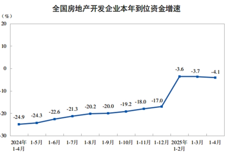 01月から04月までの不動産開発業者向け資金は3兆2,596億元で、前年同期比4.1%減少した。