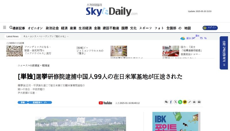 2025年05月20日、ソウル警察庁サイバー捜査隊は、偽計公務執行妨害(選挙管理委員会の業務を妨害したとみなされる)などの容疑で、『スカイデイリー』所属のホ某記者に対し、15日に逮捕状を請求した――と明らかにしました。