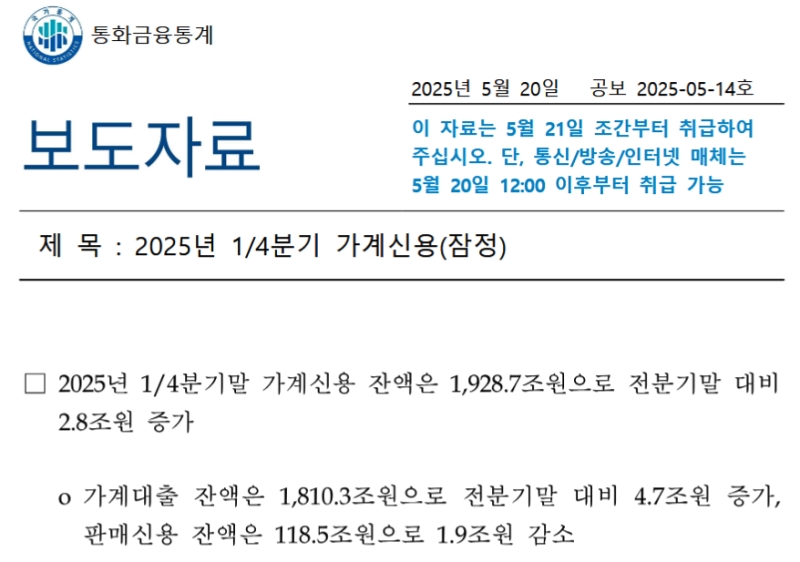 2025年05月20日、『韓国銀行』は「2025年第1四半期中の家計信用(暫定)」を公表しました。