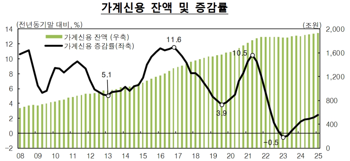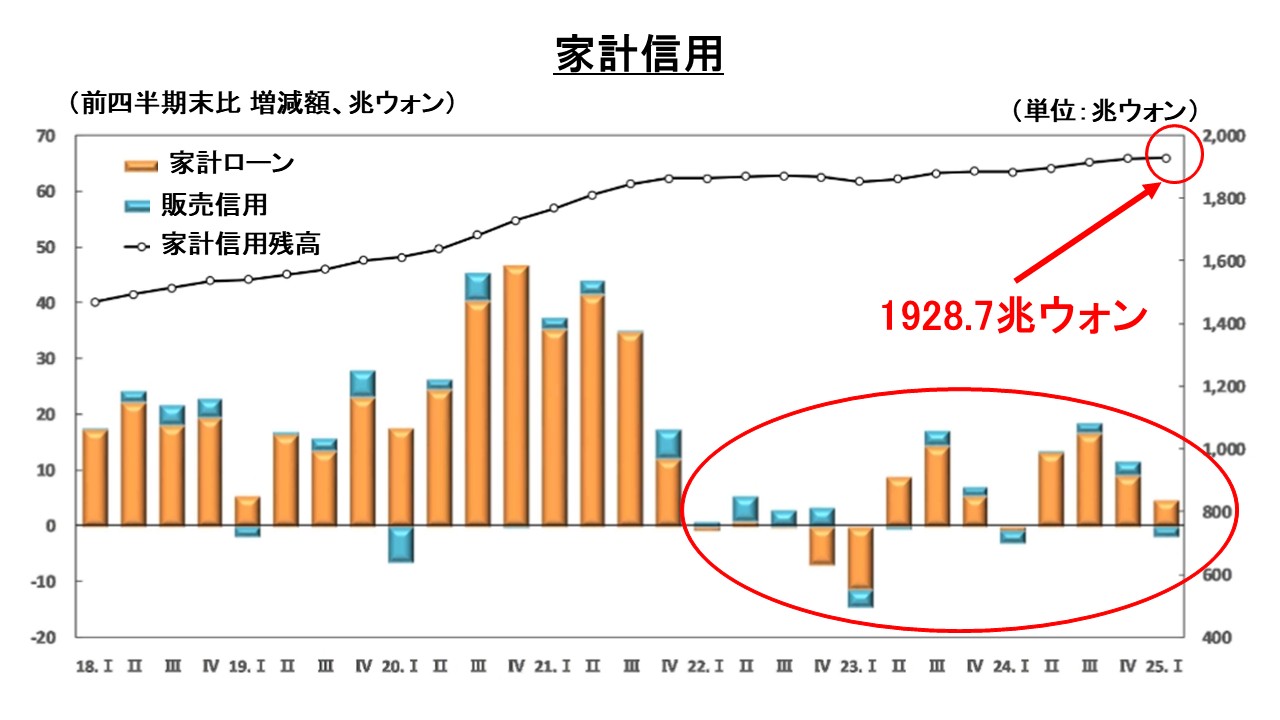 □2025年 第1四半期末の家計信用残高は1,928.7兆ウォンで、前四半期末比で2.8兆ウォン増加