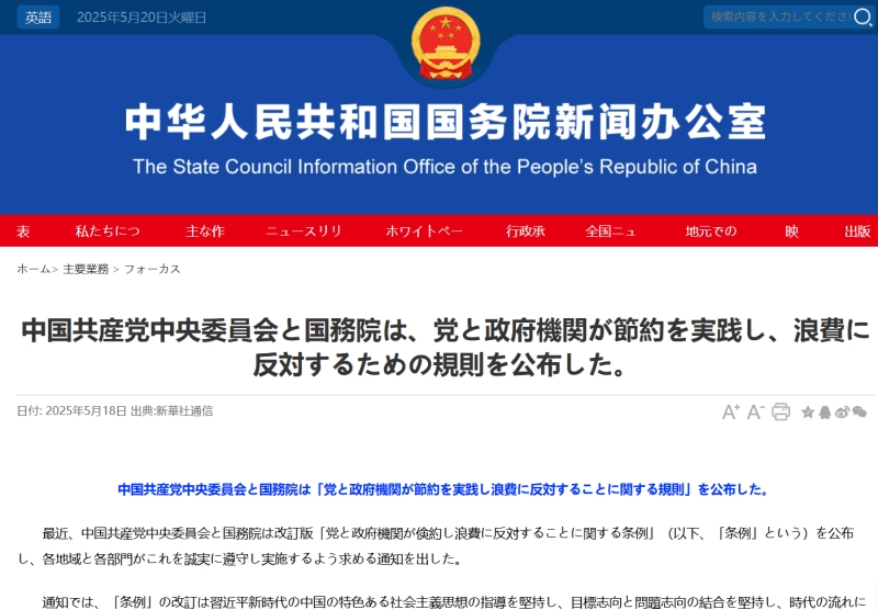2025年05月18日、中国の国務院の新聞弁公室は「中共中央 国务院、党政機関における節約の徹底と無駄遣いの防止に関する条例を公布」と公表しました。
