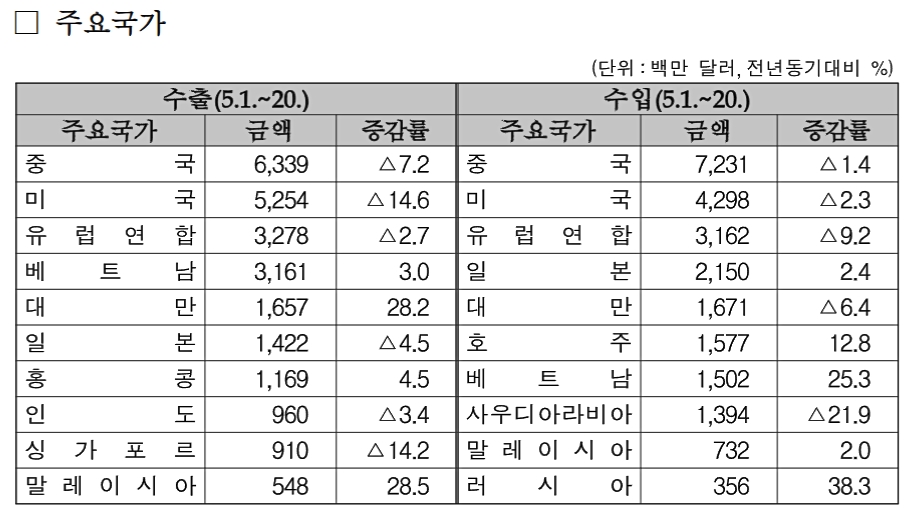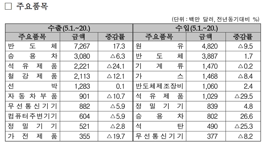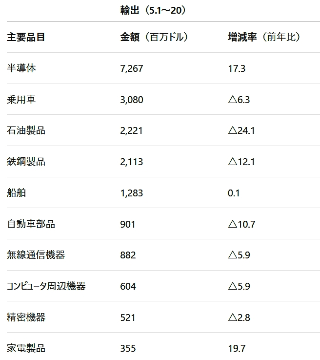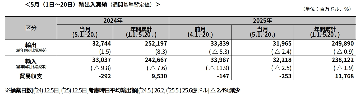 2025年05月21日、韓国の関税庁が「’25年05月01日~05月20日の輸出入状況」を公表しました。