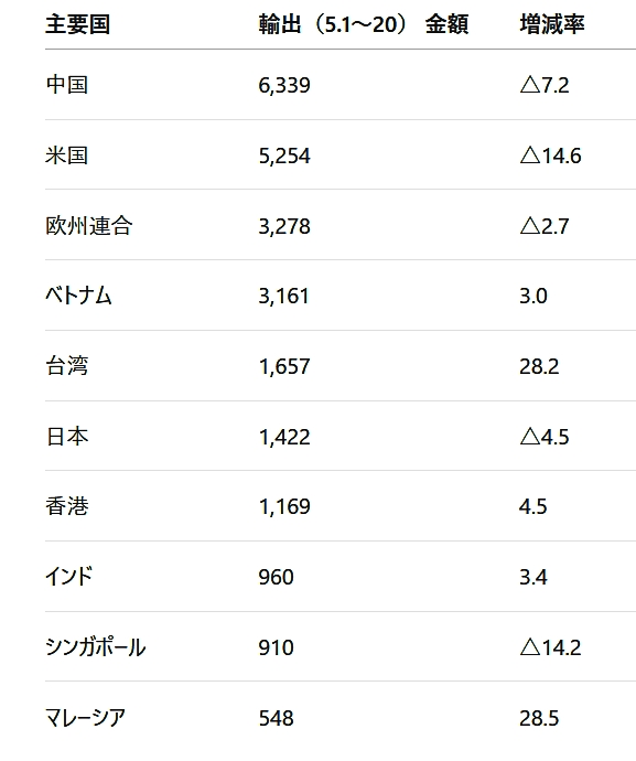 ⇒参照・引用元:『韓国 関税庁』公式サイト「’25年05月01日~05月20日の輸出入状況」