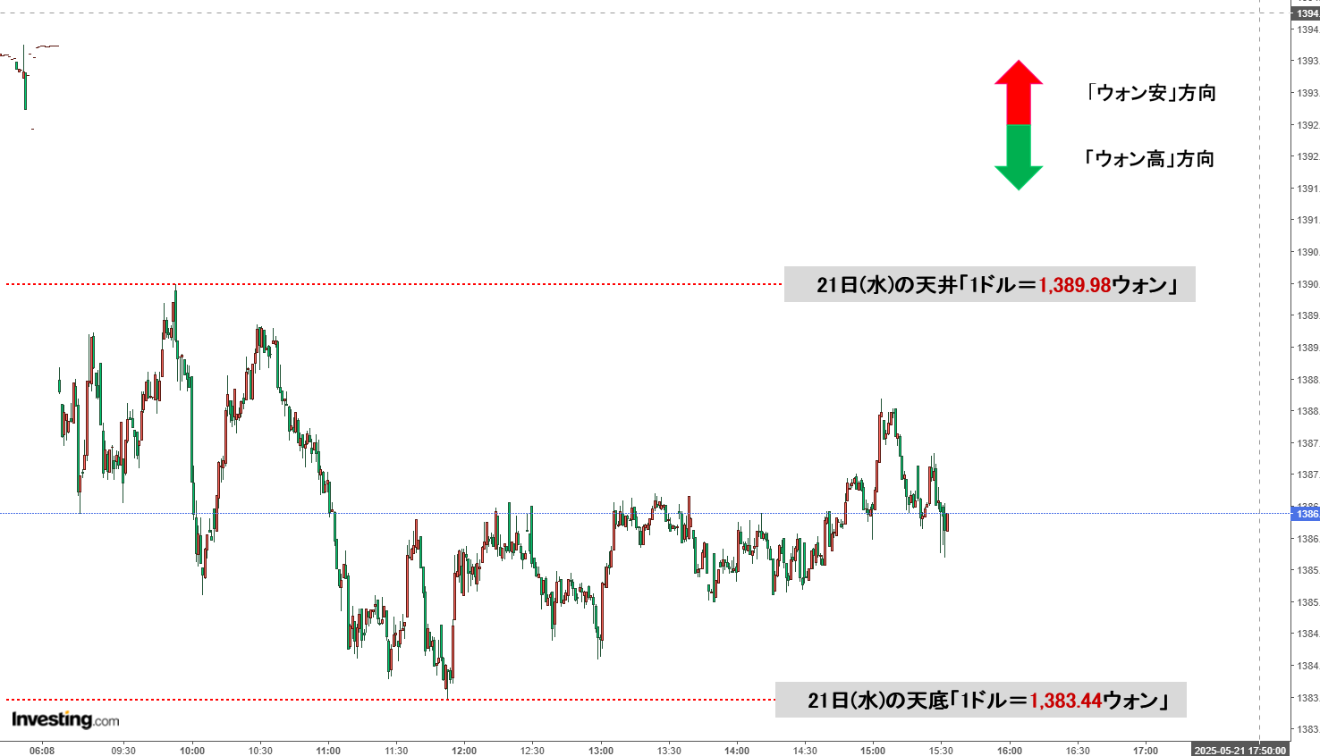 2025年05月21日(水)15:30現在、ドルウォンのチャートは以下のようになっています(チャートは『Investing.com』より引用)。