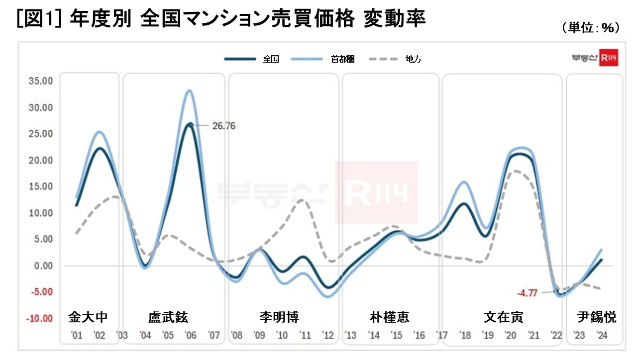 金大中(キム・デジュン)政権から尹錫悦(ユン・ソギョル)政権まで、最も住宅の売買価格が高騰した時期は、盧武鉉(ノ・ムヒョン)政権時の2006年で、その上昇率は実に「26.76%」に達しています。